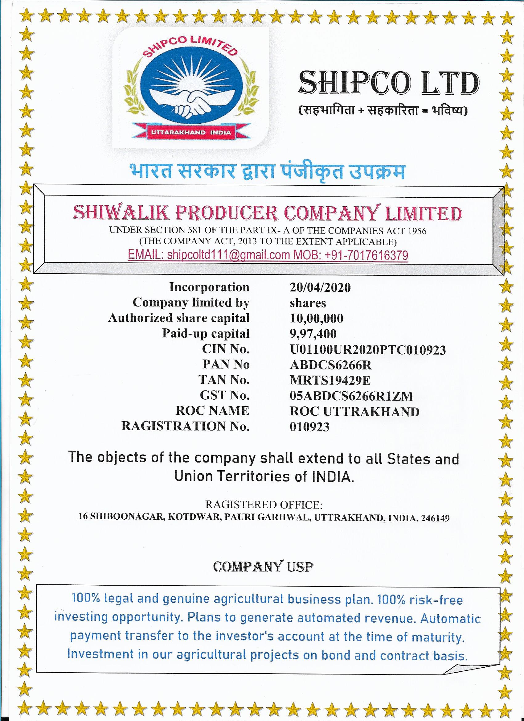 SHIPCO Lid कंपनी अधिनियम 1956 के अंतर्गत भारत सरकार से पंजीकृत और मान्यता प्राप्त किसान उत्पादक कंपनी है। हम सम्पूर्ण उत्तराखंड में मसालों कि खेती के उत्पादन और संवर्धन के साथ विभिन्न कृषि आयामों पर कार्य कर रहे है।